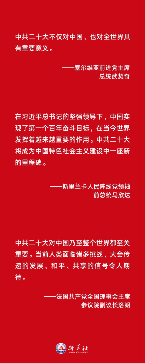 斯里蘭卡人民陣線黨領袖、前總統馬欣達表示,在習近平總書記的堅強領導下,中國實現了第一個百年奮斗目標,在當今世界發揮著越來越重要的作用。中共二十大將成為中國特色社會主義建設中一座新的里程碑。