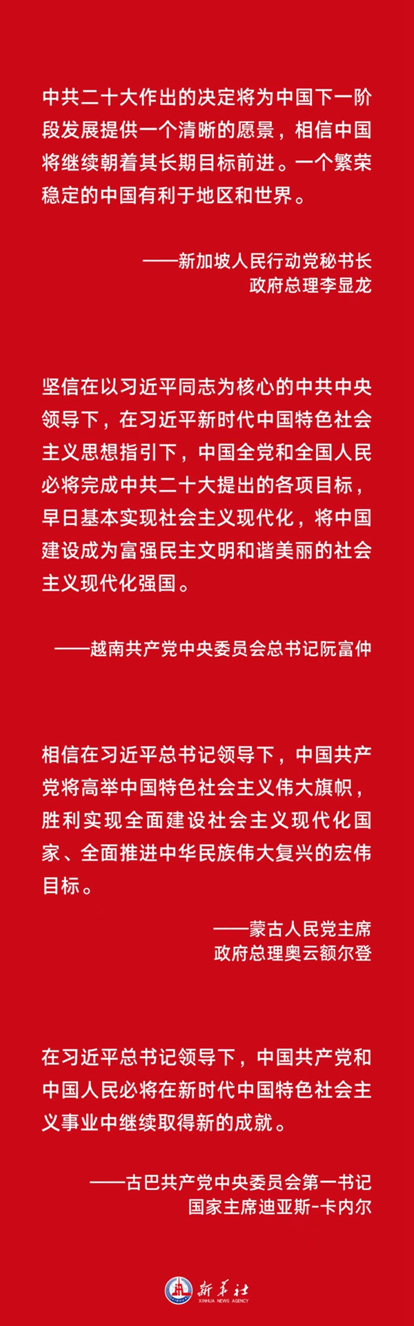 中共二十大回顧總結了過去五年的工作和新時代十年的偉大變革,描繪了以中國式現代化全面推進中華民族偉大復興的宏偉藍圖。各國政黨政要通過賀電賀函表達他們對中國的未來充滿信心,堅信中共必將團結帶領中國人民不斷譜寫新時代中國特色社會主義新篇章。