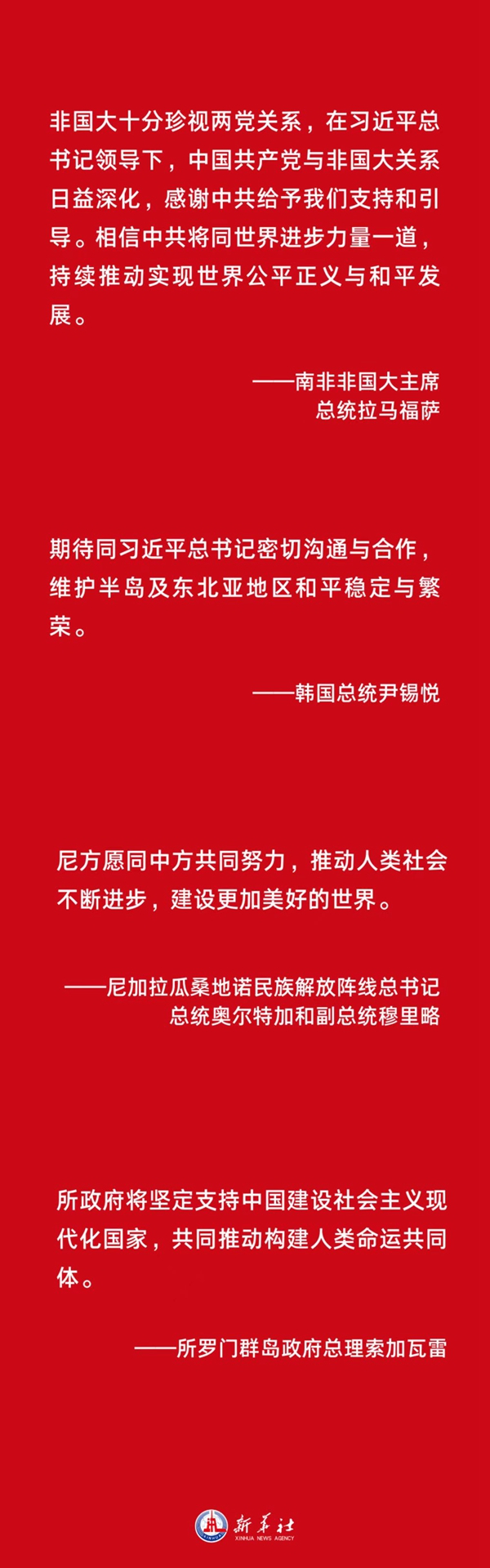 南非非國大主席、總統拉馬福薩表示,非國大十分珍視兩黨關系,在習近平總書記領導下,中國共產黨與非國大關系日益深化,感謝中共給予我們支持和引導。相信中共將同世界進步力量一道,持續推動實現世界公平正義與和平發展。