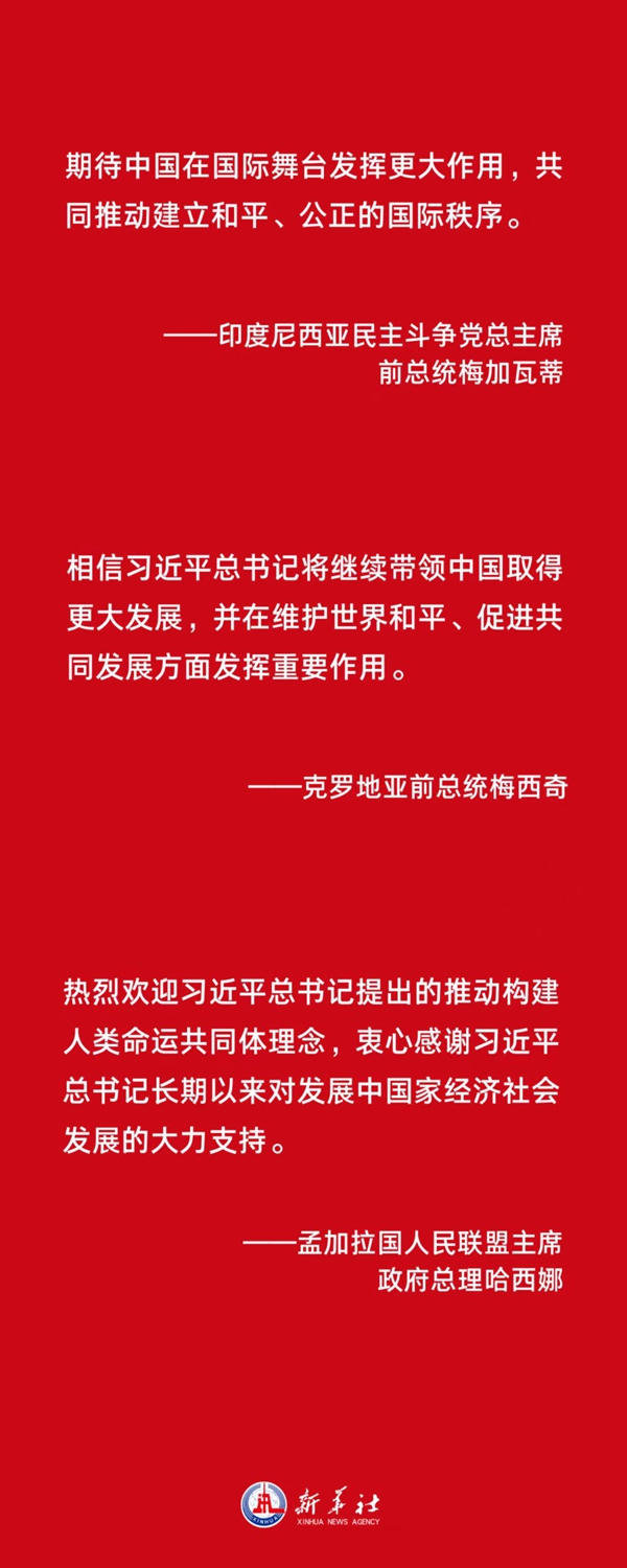 這是黨心所向、民心所盼、眾望所歸,是歷史的選擇,人民的選擇,時代的選擇。各國政黨政要感佩于這份源自中共全黨和中國人民衷心擁戴的崇高威望,通過賀電賀函表達他們對習近平總書記再次全票當選的祝賀與敬佩之情。