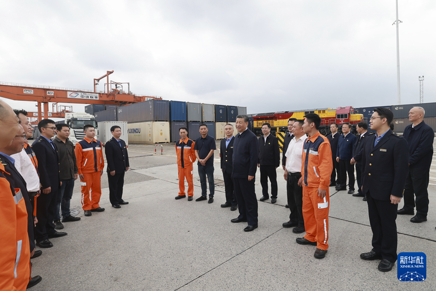??4月22日至24日,中共中央總書記、國家主席、中央軍委主席習近平在重慶考察。這是22日下午,習近平在重慶國際物流樞紐園區重慶鐵路集裝箱中心站,同貨車司機、列車司機、裝卸工人、場站管理人員等親切交流。新華社記者 岳月偉 攝